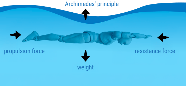 Any object immersed in a liquid, receives a push from the bottom to the top equal to the volume of the fluid displaced by the object. This thrust is proportional to the volume of the diver and not to his weight.