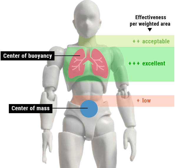 As the weight is placed too far below the lungs, it raises the front of the body and offers too large an area of resistance to water.