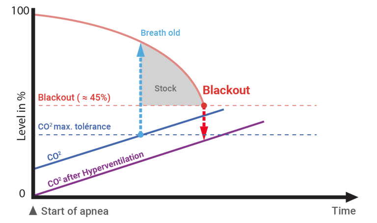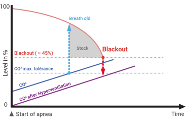 Hyperventilation occurs when you increase your breathing rate along with accentuated inhalation. This leads to an increase in oxygenation and a decrease in carbon dioxide. However, it’s important to note that hyperventilation does not increase oxygen saturation in your blood—it only lowers CO₂ levels. Since it’s the accumulation of CO₂ that signals the need to breathe, low CO₂ levels delay this warning, which can result in a blackout, as shown in the purple curve.